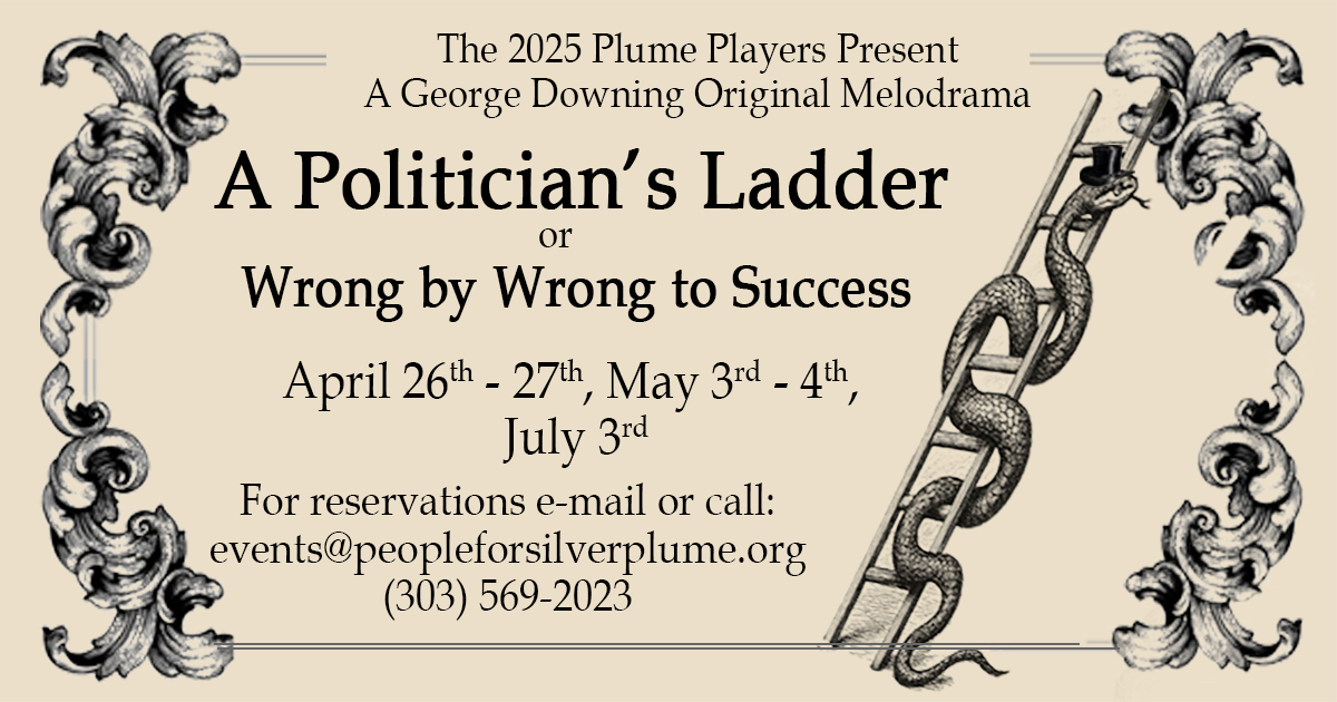 After a pandemic sized shutdown, and challenging reboot, The Silver Plume Melodrama is returning to the George Downing Playhouse. This year we reprise A politician’s Ladder, or Wrong by Wrong to Success, forty years after the original 1985 production. This is a celebration of the largest community-based, volunteer fundraising initiative for the preservation of Silver Plume’s historical structures. Over 500 volunteer hours are donated by the community to make this production come to life. We are excited to have a Clear Creek County based cast and crew, directed by Silver Plume local, and George Downing’s protégé, Nicholas Regester. Please join us for this dinner theater and support the preservation of this unique historic community.